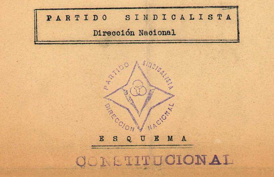 Curiosamente, hemos encontrado documentación perteneciente a otro Partido Sindicalista posterior, entre 1947 y 1948. Se trata de varios programas políticos y de tres ejemplares de El Sindicalista editados en España clandestinamente por la Dirección Nacional del partido[11]. Parece que los programas no proceden de militantes del interior adscritos al partido oficial, pues ni siquiera el sello utilizado, tres anillos entrelazados en una estrella de cuatro puntas, se corresponde con el tradicional que representa a Prometeo portando una antorcha. En cuanto al ideario, aparentemente pestañista, deriva ya a un corporativismo de corte franco-falangista en que a la Cámara Sindicalista se suma otra denominada de la Propiedad, en un intento de conciliar capital y trabajo, y donde el derecho de huelga queda restringido al mínimo para asegurar los intereses de la economía nacional. El poder legislativo recaería en una Cámara Ciudadana, cuyos miembros serían elegidos de las candidaturas de los únicos dos partidos legales que baraja la propuesta: el Partido Popular Cristiano y el Partido Sindicalista. Para no entrar en detalles, baste destacar que este esquema constitucional fue comentado en el diario Arriba de 6 de septiembre de 1947[12].