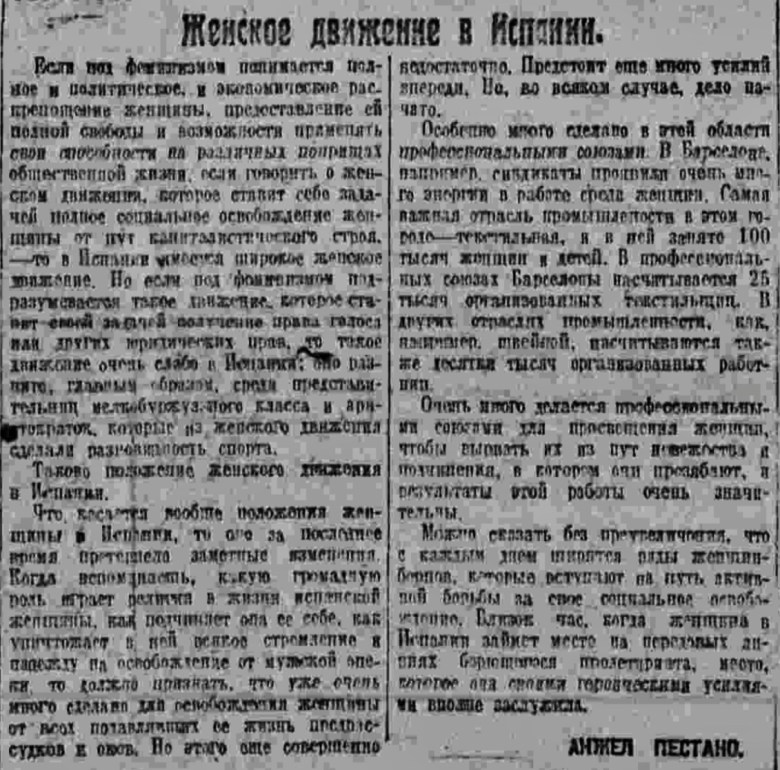 Si se entiende el feminismo como la completa emancipación política y económica de las mujeres, dándoles plena libertad y la oportunidad de usar sus habilidades en diversos campos de la vida pública; si hablamos del movimiento de las mujeres, que tiene como objetivo la tarea de la completa liberación social de las mujeres de las cadenas del sistema capitalista, España tiene un amplio movimiento femenino. Pero si feminismo significa un movimiento que apunta a obtener el derecho al voto u otros derechos políticos, entonces ese movimiento es muy débil en España; se desarrolla principalmente entre las representantes de la clase pequeñoburguesa y las aristócratas, que han hecho una especie de deporte del movimiento feminista. Esta es la posición del movimiento de mujeres en España.