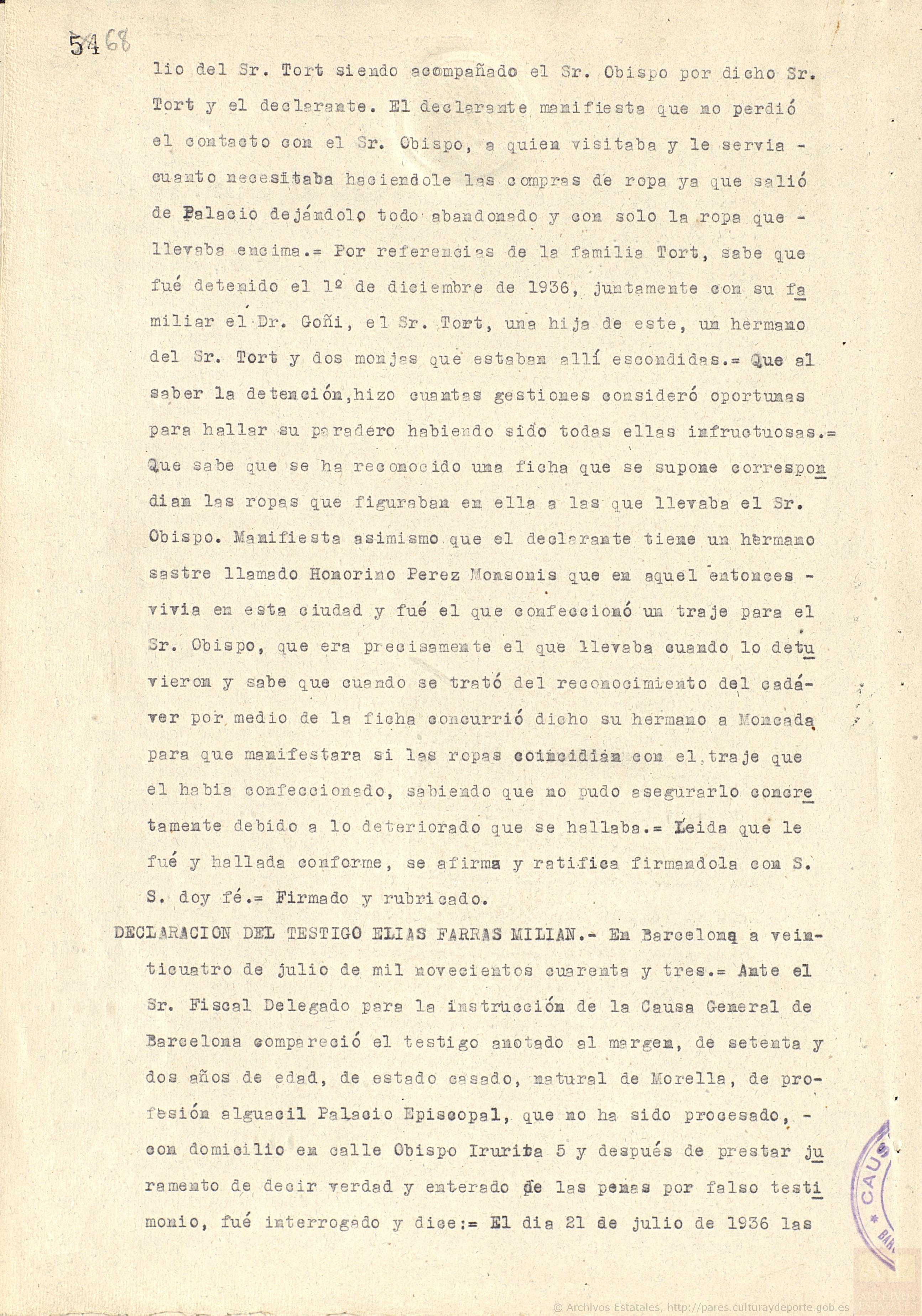 “Al cabo de un rato bajaron junto con el obispo de Barcelona Dr. Irurita, (después se enteró la declarante que lo era, puesto que hasta entonces no lo había sabido) Don Antonio Tort, don Francisco, y la Srta., Mercedes Tort, y además un señor que no conocía la declarante, del cual cree que dijeron que era el secretario, pero no puede asegurar que lo fuese. […] Sobre las nueve de la noche del mismo día regresó la Srta. Mercedes, la cual le dijo a la declarante que la habían dejado en libertad, pero no así a su padre y tío y demás detenidos”.