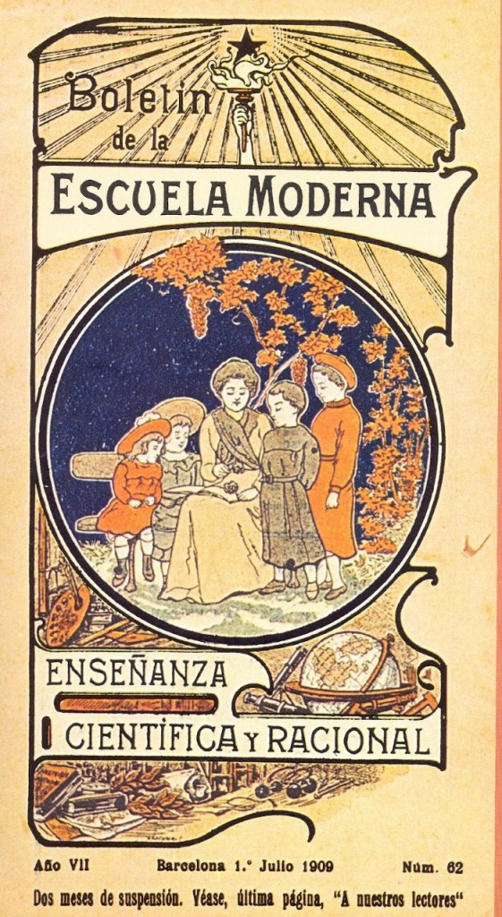 Algo más lejos, en Barcelona, el pedagogo Francisco Ferrer Guardia, en 1901 inauguró la primera Escuela Moderna. No fue un centro educativo más, pues abrió las puertas a la renovación pedagógica del mundo de su tiempo. Ferrer, un declarado librepensador y anarquista, planteó un completo sistema basado: en el laicismo, un racionalismo de base igualitaria, el apoyo mutuo, el juego y la ciencia. En sus aulas introdujo la enseñanza mixta, eliminó los premios y los castigos en la infancia, descartó los exámenes, empleó técnicas como la correspondencia escolar (después aceptada por Freinet), o el cuidado de la higiene como método preventivo de enfermedades.