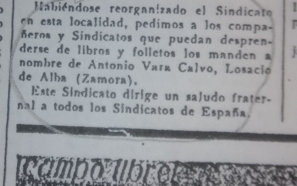En la provincia, tenemos constancia de la sincera petición de libros y publicaciones, en las páginas del semanario “¡Campo Libre!”, por parte de cenetistas de Losacio de Alba, probablemente para intentar crear una biblioteca popular en la localidad, en el año 1936.