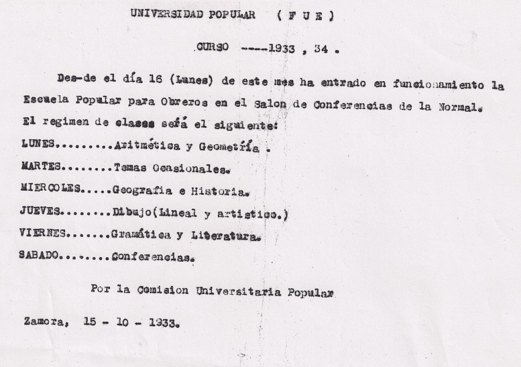 Programación de la Universidad Popular de Zamora, curso 1933-34