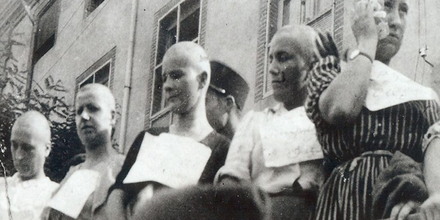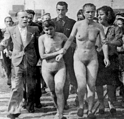 Las humillaciones que podían sufrir las mujeres acusadas de alternar con los ocupantes y/o de estar a su servicio, eran numerosas. En efecto, estas iban desde colgarles un cartel en el que estaba escrito que eran unas zorras vendidas al enemigo hasta pintarles cruces gamadas en la cabeza o en otras partes de su cuerpo, entre otras. Por supuesto, como hemos dicho, no faltaba el paseo por las calles para exponerlas a público escarnio y, en algunos casos, como se aprecia en la imagen superior, junto a una mayoría masculina también participaban otras mujeres.