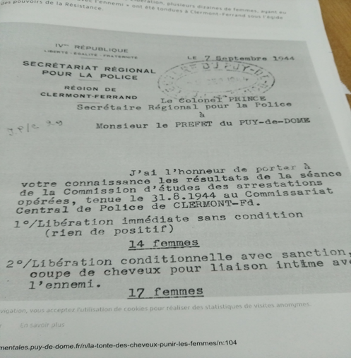 relación íntima con el enemigo.” Fuente: Archives départamentales 63. Puy-de-Dôme.