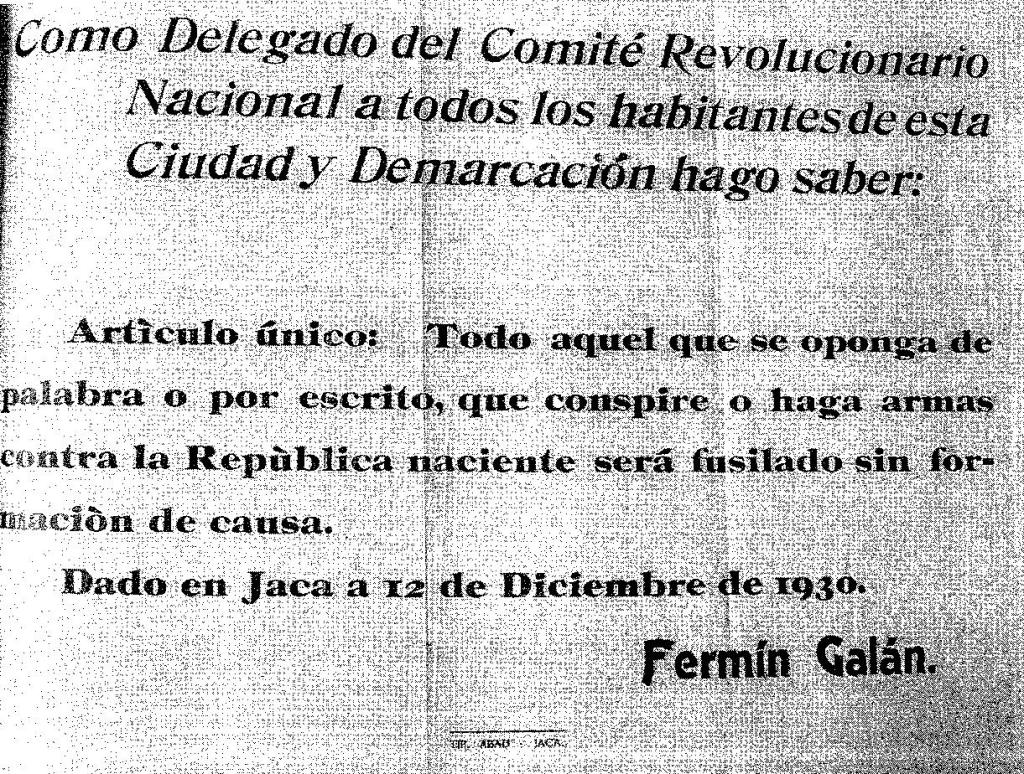 A primera hora de la mañana del 12 de diciembre de 1930 en el ámbito civil tuvieron lugar una serie de acontecimientos significativos en Jaca. Alfonso Rodríguez, el Relojero y Vicente Malo, ambos pertenecientes al grupo civil de conspiradores, tras convencer de malos modos a Fausto Abad, dueño de la imprenta local, consiguieron que éste les imprimiera 40 ejemplares de un bando revolucionario redactado con el tipo lenguaje cuartelero y un punto amenazador decía así: