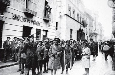 Con él aún caliente, ambos personajes corrieron camino del Ayuntamiento, sito en la Calle Mayor, donde impaciente le esperaba un pelotón de soldados y una banda de música militar junto con un cornetín de órdenes. A la cabeza de los musicos el maestro Julián Viu Bonet, mientras que el pelotón de militares estaba bajo el mando del capitán sublevado José María Piaya.