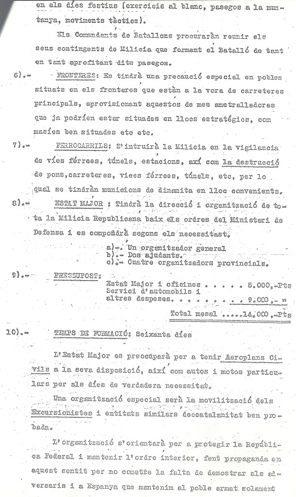 En las fronteras: Se debería tener una especial atención en los pueblos fronterizos situados en sus inmediaciones y cerca de las carreteras principales, aprovisionandolos de más ametralladoras, que deberían situarse en los lugares estrategicos, como masías con buenas vistas. Ferrocarriles: Se tendría que instruir a la Milicia en la vigilancia de vías ferreas, túneles, estaciones, así como en la destrucción de puentes, carreteras, vías férreas y túneles, por lo que se tendrá “munición” (sic) en los lugares más convenientes, sin especificar que lugares deberían ser o de donde saldría el material explosivo, o cómo se formaría al personal. Y finalmente El Estado Mayor, que estaría bajo la dirección del Ministerio de Defensa se compondría de: un organizador general (se supone que sería él mismo Fages). Dos ayudantes, y cuatro organizadores más provinciales, En el capitulo de presupuesto, el Estado Mayor y las oficinas costarían 5.000.- pesetas, y para automóviles y otros gastos, 9.000.- pesetas más, sin especificar de dónde saldría el dinero.