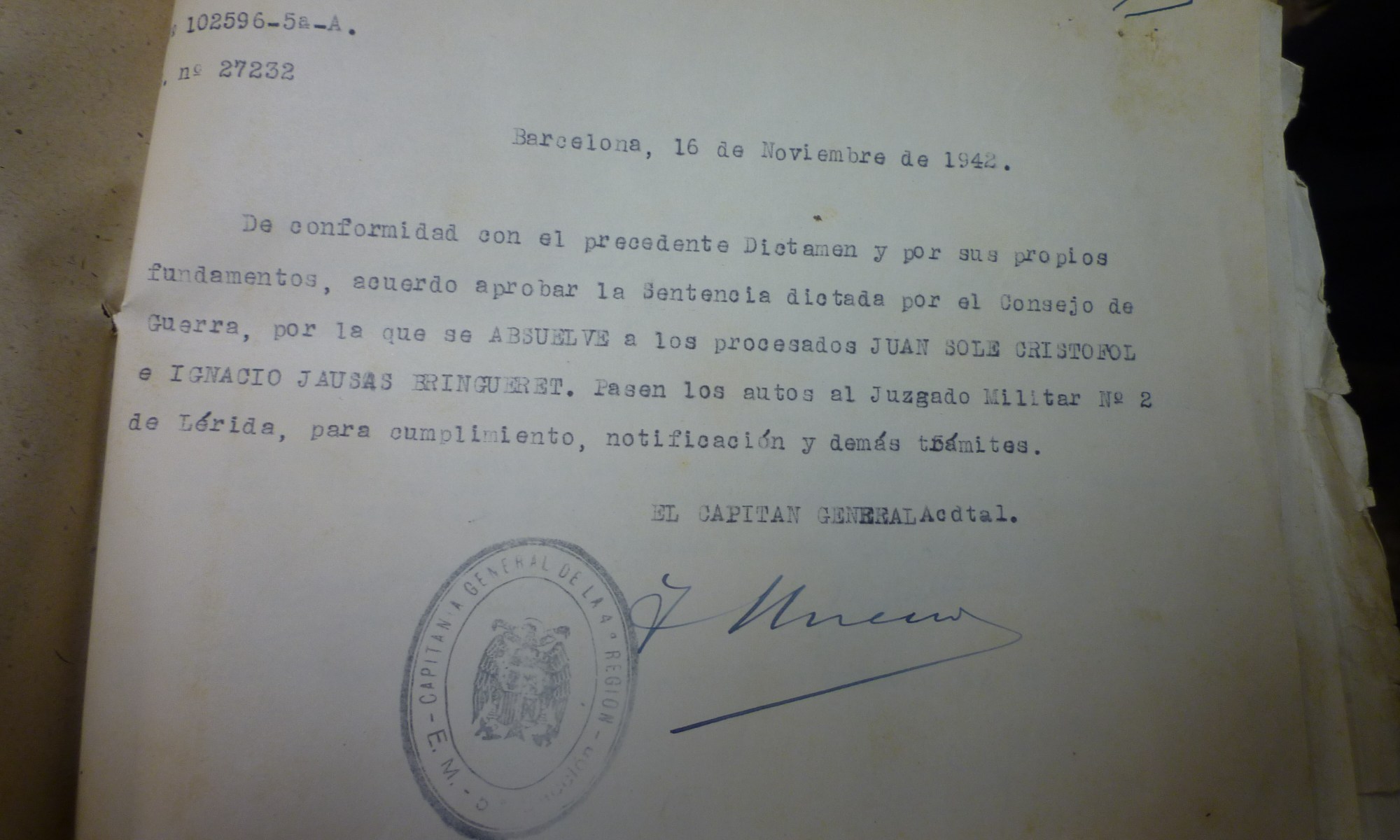 Una prueba palpable de que tanto los avales de Solé como los de Jausàs fueron considerados como buenos por el tribunal militar, fue que el día 16 de noviembre de 1942, el Capitán General de Cataluña firmó sus respectivas Absoluciones, de acuerdo con la sentencia anterior y en el mismo sentido dada en el Sumarísimo en una sentencia conjunta.