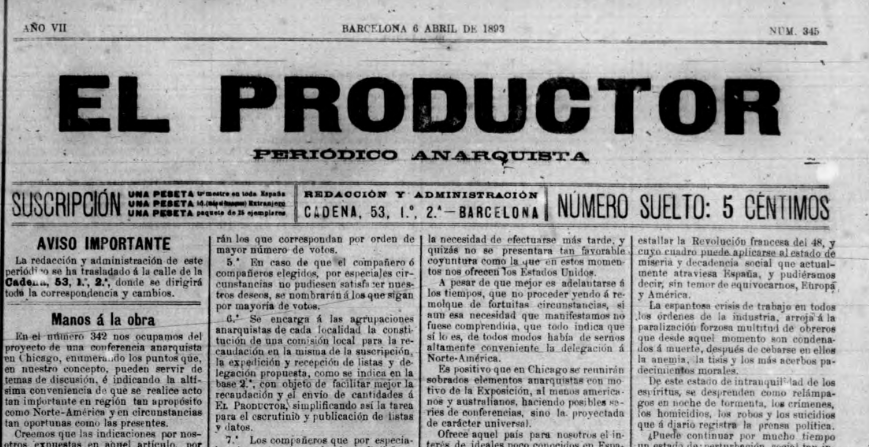 Con el resto del estado los contactos se produjeron con una treintena de localidades, destacando entre ellas a personalidades como Miguel Rubio en Sevilla (y que en breve se desplazará a Barcelona), el Grupo Berkman de Algeciras5, quienes estaban detrás del periódico El Oprimido, con Francisco Ruiz en Madrid, célebre porque ese mismo 1893 atentaría fallídamente contra Cánovas del Castillo. Como curiosidad, en el mismo número de El Productor del artículo aquí analizado («Manos á la obra»), escribió un suelto. Formó parte del entorno de La Anarquia de Madrid, publicación «hermana» de El Productor. El resto, diversos contactos en poblaciones con presencia estable anarquista, muchas de ellas varias andaluzas y de lugares más concretos del resto del estado, como Zaragoza, Sestao, Tafalla, El Ferrol o los compañeros de El Corsario de La Coruña.