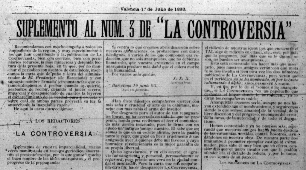 De hecho el autor de la carta de Reus, posiblemente Juan Montseny, afirmaba que una misiva que se había recibido en la administración de La Controversia, en nombre del gerente de El Productor y firmada por otros anarquistas de dicho entorno, en la cual se amenazaba e insultaba a los integrantes de La Controversia, no podía ser verídica, puesto que no creía “que tal documento esté escrito de la persona que vosotros suponéis, ni siquiera creo que sea escrito de un anarquista. Si tal creyera, desconocería por completo los efectos que causa en el hombre la concepción de la Anarquía”11. Dicha carta amenzante, que fue editada como suplemento al periódico, era un compendio de incongruencias e insultos gratuitos, lo cual me inclinaría a dar por válida la hipótesis de Montseny en cuanto a la mala fe de la autoría, pero falsedad en la misma. Aunque por lo planteado desde las páginas del periódico valenciano, sí que se le dio valor a la misma y se respondió con amenazas hacia el no nombrado gerente del periódico barcelonés.