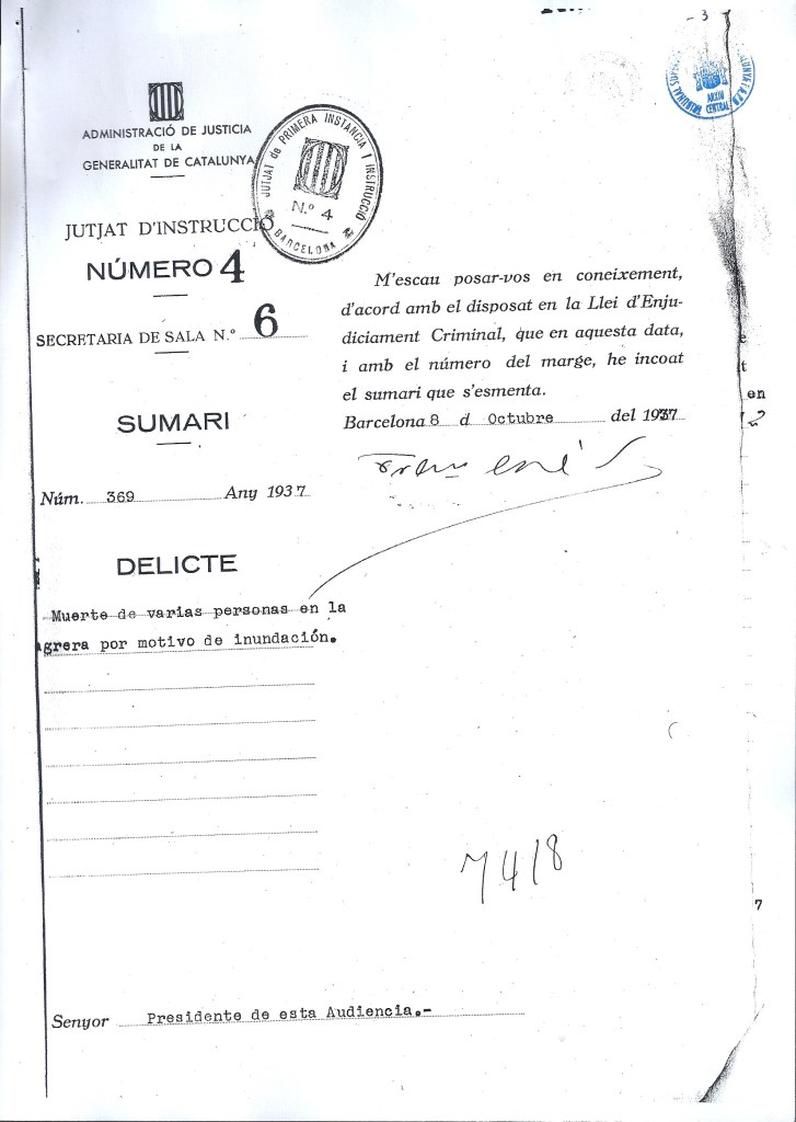 Aquel elevado número de victimas, cuatro de ellas con nombres y apellidos, y de hecho, seis más, sin identificar, provoca la inmediata apertura, aquel mismo día, de una causa judicial, que incoa el Juzgado nº 4 de Barcelona, con el número de sumario 369, de aquel año de 1937.