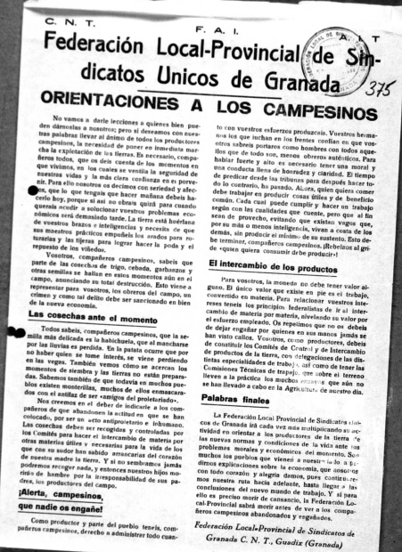 «Nuestra Confederación alcanza potencia y se extiende por doquier. Lo prueba, quehasta hatomado arraigo en lo mas alto de la tierra de Baza (Granada), donde desde elmes de marzo esta constituido un Sindicato de Campesinos.