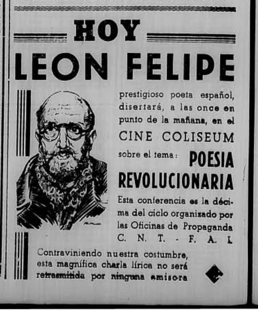 El periodista terracampino, excelente narrador, prosigue con el hilo de sus recuerdos: «León Felipe recala en Barcelona e inmediatamente sienta sus reales en la tertulia de un café próximo al teatro Tivoli, en el paseo de Gracia. En la tertulia se habla de todo. Pero solo se habla. Y él, aunque poeta, es hombre de acción. Ansía ver la Guerra Civil de cerca, por sí mismo. Más no sabe cómo hacer para ello».