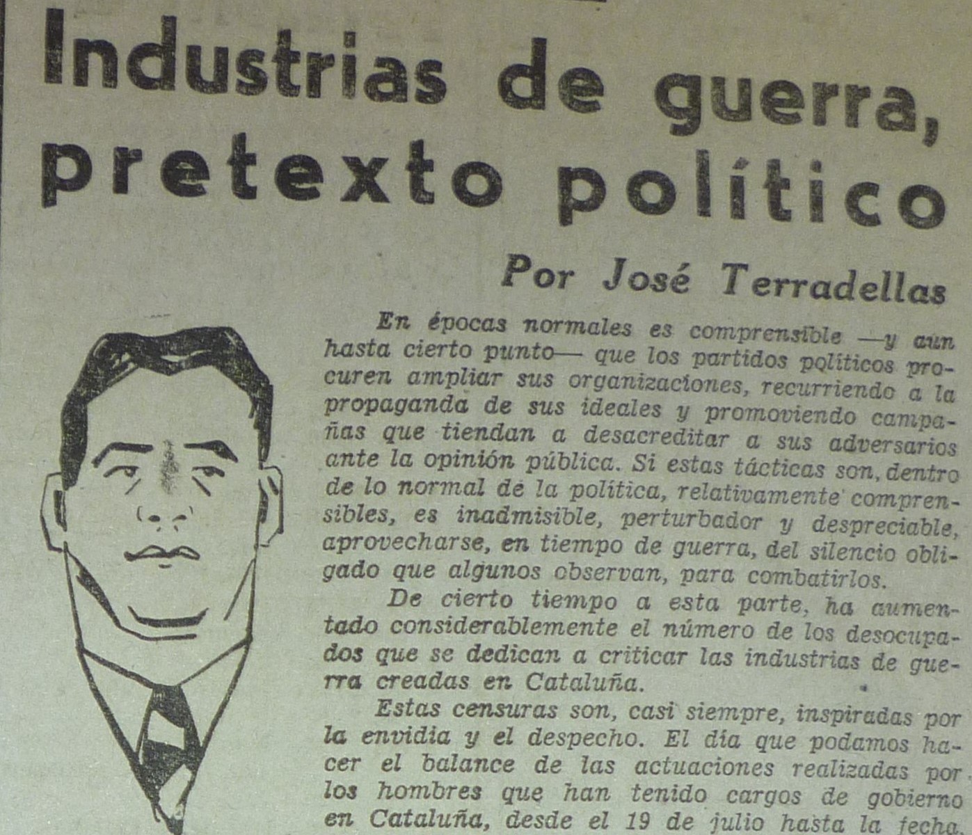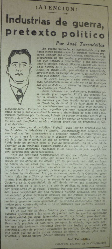 En este contexto histórico, Solidaridad Obrera publicó un artículo de Josep Tarradellas13, en el que el Consejero Primero de la Generalidad respondía a las infamias y errores publicados el día anterior en Treball, órgano del PSUC, respecto a Industrias de Guerra, que demostraba “una ignorancia absoluta de las materias de que se atreven a hablar”.