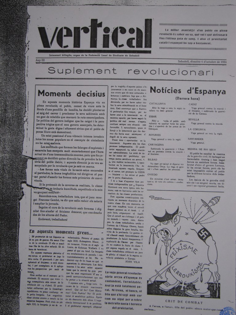 En Sabadell, en todos los sectores industriales, las cifras más elevadas de conflictividad se cuantifican en el año 1933 (tras la represión de octubre del 34 las hostilidades disminuyeron). Recién comenzado aquel año, se produjo una huelga general revolucionaria en diferentes lugares del Estado. Desde Vertical, órgano de la FLS, se decía que, en la localidad, el conflicto se fraguó en ciertos ambientes del sector de la construcción dominado por los anarquistas, y que en la base estaba la demanda de las seis horas, para todo el ramo, y la aceptación de la bolsa de trabajo, entre otras mejoras. Es decir, que involucraban al ramo de la edificación en el estallido del conflicto.