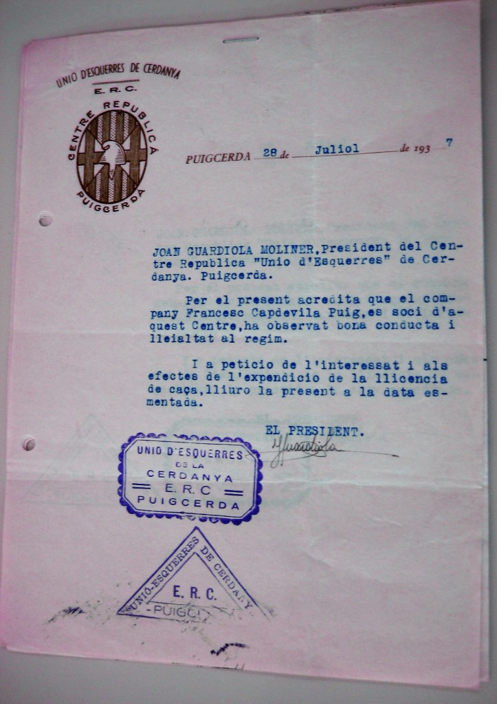 A diferencia de lo sucedido en muchos otros pueblos, donde si en enero había ganado las elecciones ERC, después del golpe todos sus concejales habían sido destituidos, y ocupados sus cargos por personajes de derechas, nombrados a dedo por el ejército. Por ello la diferencia que se dio, en el caso concreto de Puigcerdá, fue únicamente la expulsión de los dos únicos concejales de ERC que había en el consistorio, antes vista. Adscripción política a ERC que consta como tal en toda la documentación oficial del Centro de la Unió d´Esquerres de la Cerdanya, al cual pertenecía aquella “minoría” destituida.