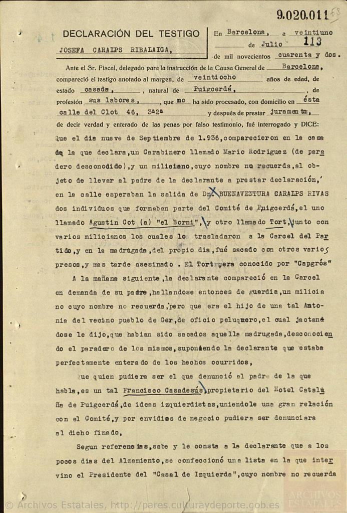 7Testimonio de Josefa Caralps Ribalaiga, por la muerte de su padre Buenaventura Caralps Rivas Véase el anexo número 20 del libro Nacionalistas contra anarquistas, así como el anexo documental de este artículo