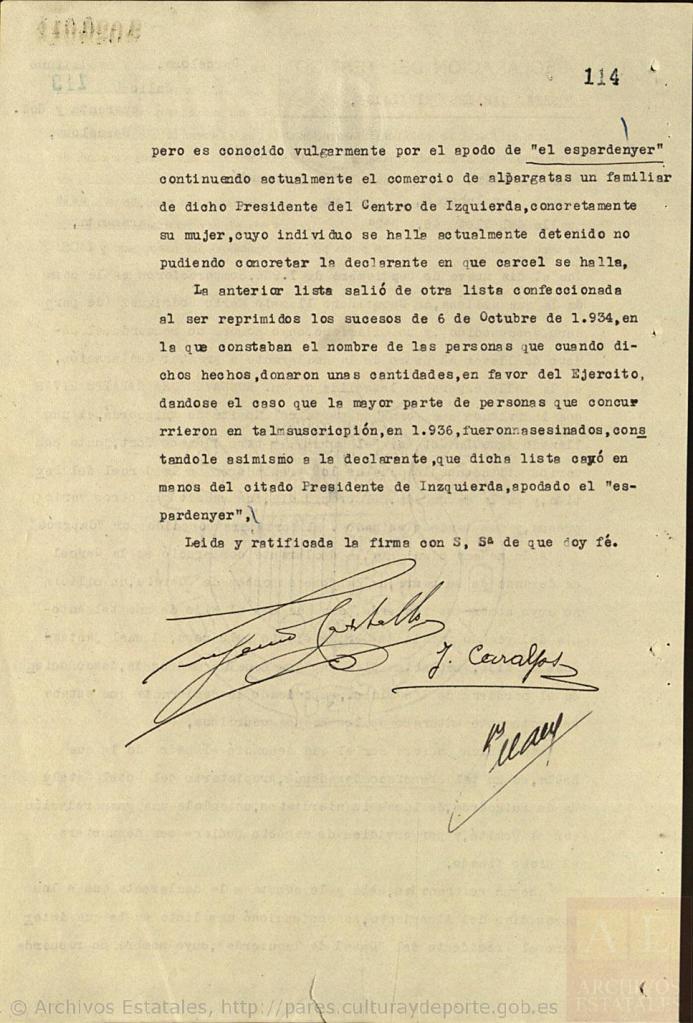 La anterior lista salió de otra lista confeccionada al ser reprimidos los sucesos de 6 de octubre de 1934, en la que constaba el nombre de las personas que cuando dichos hechos, donaron dinero, a favor del Ejército, dándose el caso que la mayor parte de personas que concurrieron en tal suscripción, en 1936, fueron asesinados, constándole así mismo a la declarante, que dicha lista cayó en manos del citado Presidente de Izquierda, apodado “el espardenyer”25.