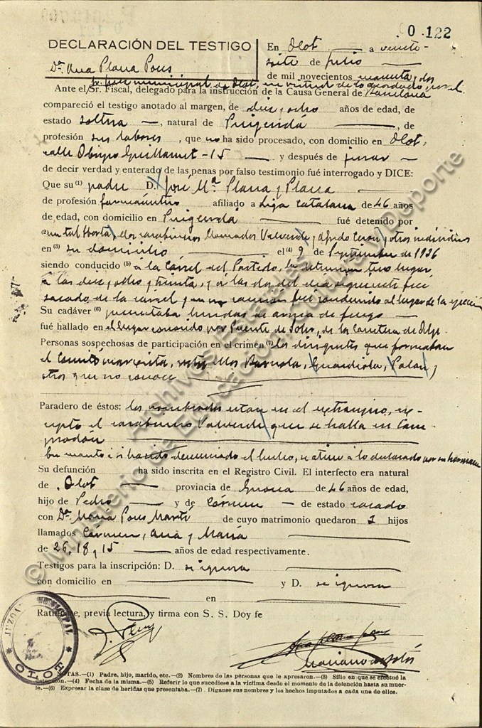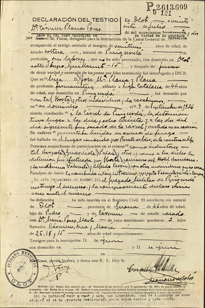 Declaración de Ana Plana Pous sobre el asesinato de José María Plana el 9 de setiembre de 1936. Farmacéutico, afiliado a la Lliga. Detenido en su domicilio por un tal Horta, los carabineros Valverde y Alfredo Cerón y otros. Encarcelado, le hicieron subir a un camión que lo condujo al lugar de ejecución. Responsables, los miembros del Comité, Barnolá. Guardiola, Palau y otros.