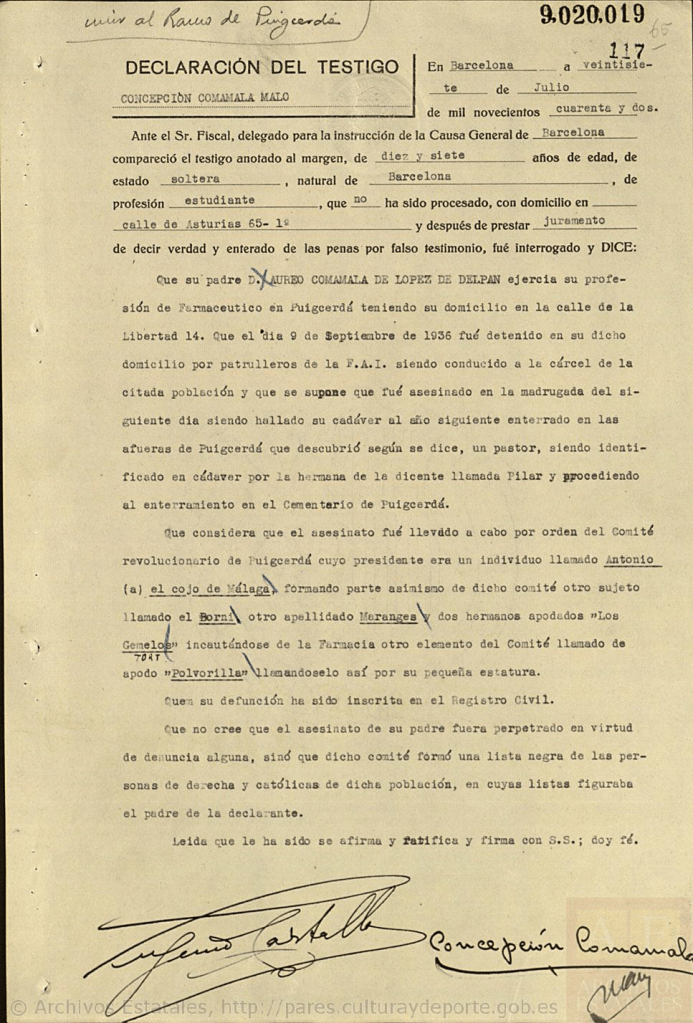 Declaración de Concepción Comamala Malo, hija de Áureo Comamala, asesinado el 9 de setiembre de 1939 en los alrededores de Puigcerdá. Fue detenido en su domicilio, llevado a la cárcel y trasladados en camión al lugar de la ejecución. Aseguró que el comité formó una lista negra de la gente a liquidar (derechistas y católicos) en la que figuraba el nombre de su padre.