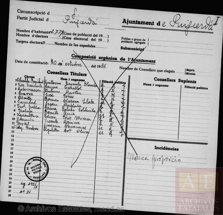 Formulario oficial de constitución del Ayuntamiento de Puigcerdá, el 20 de octubre de 1936, bautizado como Consejo Administrativo del Pueblo, tachado por un funcionario, que anotó en el apartado Incidencias: Manca proporció, es decir, que no cumplía la proporcionalidad entre organizaciones acordada por el CCMA (y el gobierno de la Generalidad).