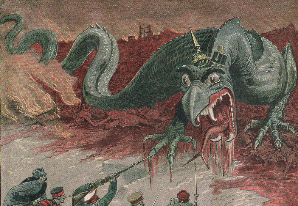 La demonización del enemigo fue uno de los recursos más empleados. En los países de la Entente se generalizó el uso del término “huno”para hacer referencia a los alemanes. Se trataba, obviamente, de equiparar a los implacables guerreros de Atila que asediaron el Imperio romano con las huestes de Guillermo II. Una vez más, la civilización se enfrentaba a la barbarie y para calificarla aparte de la ya citada “huno” se utilizaba en Francia la palabra boche, a demás de “bárbaro.” El diario Excelsior, por ejemplo, en una caricatura publicada el 18 de abril de 1915 presentaba a un militar germano con todos los atributos asociados a los invasores del siglo V de nuestra era: acto de crueldad hacia un niño y, sobre todo, la gran hacha ensangrentada.