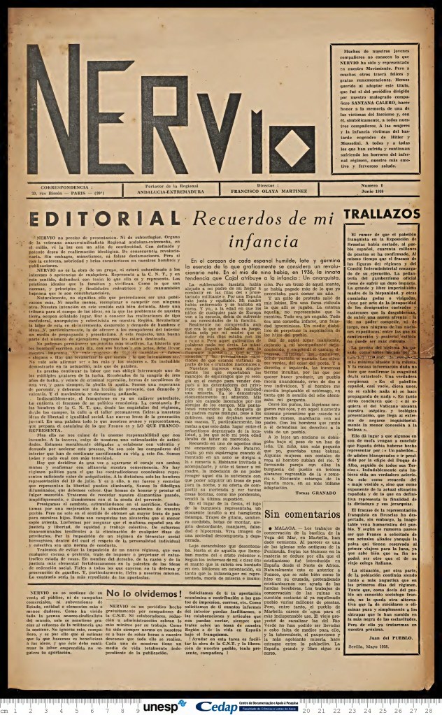Muchos de estos periódicos o revistas retomaban el mismo nombre de otras publicaciones anarquistas españolas anteriores al éxodo español. Así sucedió también con Nervio, con el que desde el primer momento colaboró Tomás Granado, órgano portavoz de la Regional Andalucía-Extremadura, cuyo primer número apareció en junio de 1958, con sede en el número 30 de la Rue Bisson, Paris, dirigido por Francisco Olaya Morales, memorable historiador del movimiento obrero español, en cuya mancheta aparecía, junto al título, la siguiente referencia:
