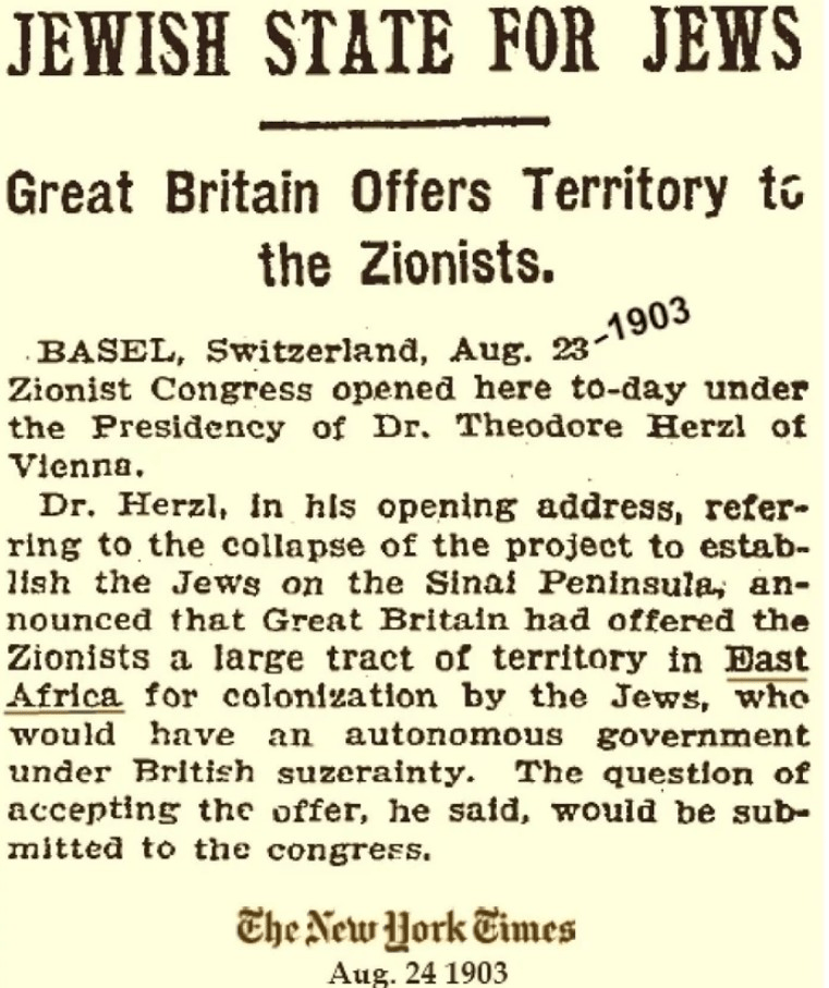 El mismo año 1902, el presidente de la OSM se entrevista con el entonces ministro de Colonias británico, Joseph Chamberlain. Este le propone el establecimiento de los judíos en Al-Arish (Egipto) a la sazón bajo el control de Londres.