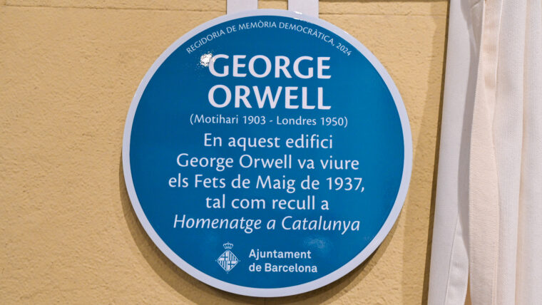 Placa de homenaje a George Orwell en el Teatro Poliorama de las Ramblas, en Barcelona. En el mirador astronómico de la Academia de las Ciencias, situado en el terrado de ese teatro, fue donde Orwell permaneció durante las Jornadas de Mayo, con fusil en mano que no tubo que usar, vigilante ante una posible salida de guardias de asalto desde el café Moka (al otro lado de la Rambla) para asaltar la sede del Comité Central del POUM, que tenían justo al lado.