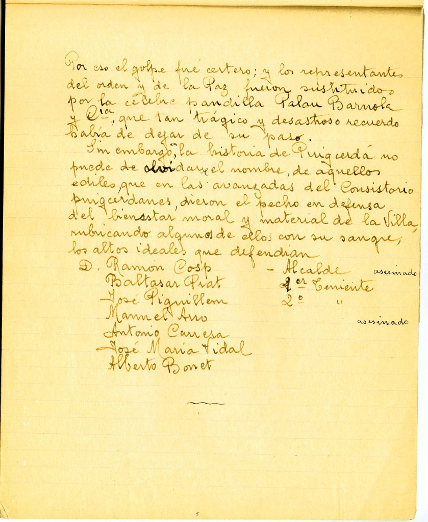Dicho trabajo, que en realidad es una crónica interesada y apasionada de la guerra civil en Puigcerdá, que está redactada por tres mujeres evidentemente partidarias del franquismo, y vecinas de Puigcerdá. Entre las muchas cosas singulares que contiene el trabajo, cabe resaltar el comentario donde se relata la substitución de la gente de orden de Puigcerdá, que formaban parte del consistorio local antes de la guerra, según ellas, por un grupo de revolucionarios y entre ellos los jefes de los que serán poco después los asesinos locales, dando los nombres de sus cabecillas, lo que a estas alturas de la Historia resulta ser una auténtica novedad, ya que dice: Por eso el golpe fue certero, y los representantes del orden fueron sustituidos por la célebre pandilla Palau, Barnola y Cia., que tan trágico recuerdo había de dejar de su paso”. 30