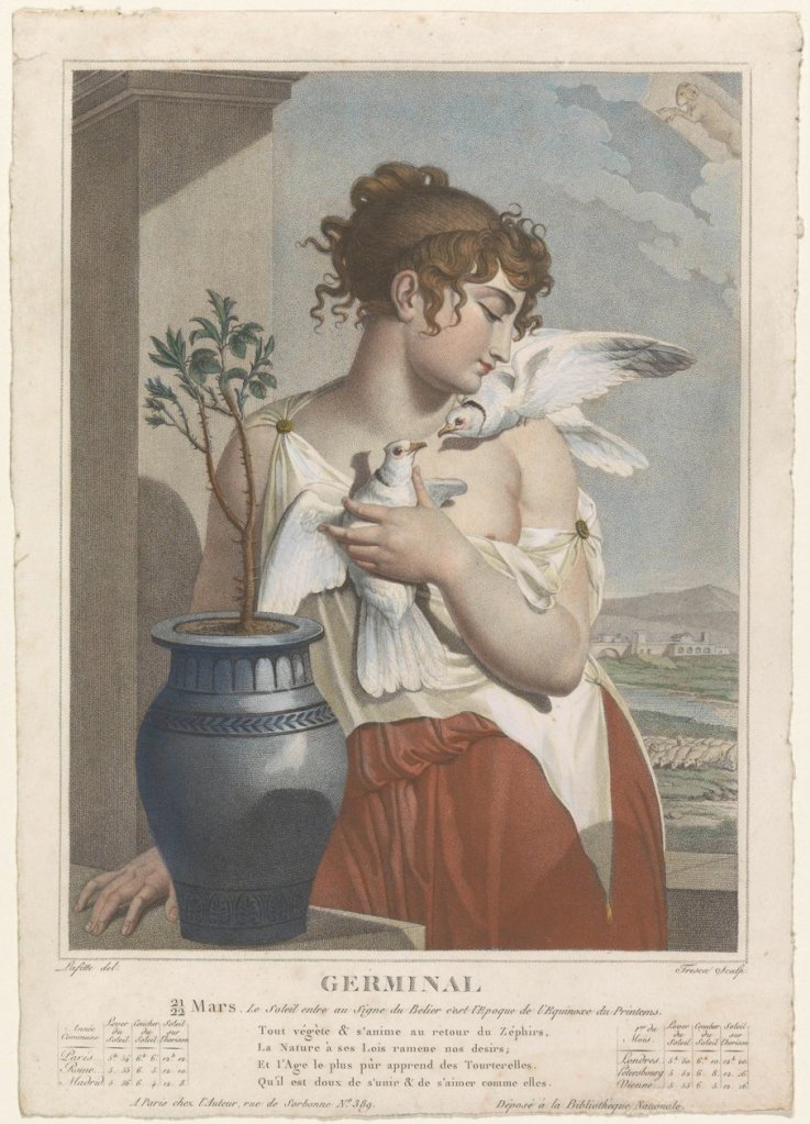 Las referencias mitológicas y religiosas del calendario cristiano-gregoriano, con meses como junio, julio o agosto, nombrados así en honor a Juno, Julio César o Augusto desaparecieron en este otro revolucionario, sustituyéndolas por menciones a la naturaleza, con el inicio del año en el equinoccio del otoño y no a inicios del invierno. Los nombres de cada uno de los meses refieren fenómenos naturales y climáticos, muchos de ellos relacionados con las tareas del campo, como Vendimiario, mes de la vendimia (septiembre-octubre), Brumario, mes de brumas y neblinas (octubre-noviembre), Frimario, mes de la escarcha, (noviembre-diciembre), Nivoso, mes de las nieves (diciembre-enero), Pluvioso, mes de las lluvias (enero-febrero), Ventoso, mes de los vientos (febrero-marzo), Germinal, mes de la primavera, cuando todo germina (marzo-abril), Floreal, mes de las flores (abril-mayo), Pradial, mes de la pradera (mayo-junio), Mesidor, mes de las mieses (junio-julio), Termidor, mes termal, del calor (julio-agosto), Fructidor, mes de las frutas (agosto-septiembre).