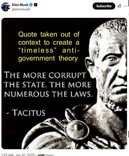 Elon Musk y Marc Zuckerberg son dos buenos ejemplos de exhibicionismo a través de las citas clásicas. “Cuanto más corrompe el Estado, más numerosas las leyes”, dijo el primero citando descontextualizadamente a Tácito. También ha invocado en sus comunicaciones en X al dictador romano Sila o hecho paralelismos poco velados entre los movimientos migratorios y el final del Imperio Romano. En la web Pharos, de Vassar College, pueden encontrarse decenas de ejemplos de la utilización de la cultura clásica como coartada de la nueva tecnocasta en general y Elon Musk en particular.
