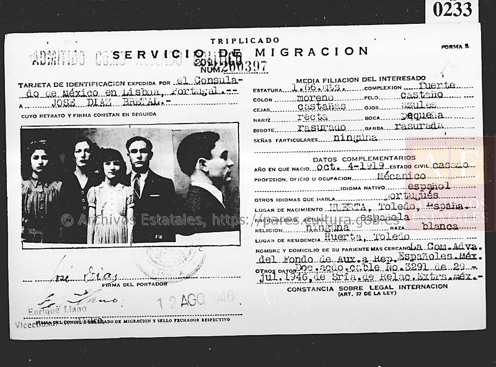 En 1945 Lisboa seguía siendo la puerta hacia el refugio, dado que Francia ya no admitía más refugiados, vista la situación de emergencia humanitaria que sufría tras la guerra. Unos 2.000 españoles, huidos del país vecino, residían semi escondidos en la capital lusa, como se desprende del mismo informe donde aparecen las Quintana Molina. Una práctica habitual del consulado mexicano lisboeta era la de facilitar un visado de tránsito hacia América a quienes llegaban sin documentación alguna, por haber pasado la frontera de forma irregular. Los barcos de transporte no aceptaban a pasajeros sin una mínima documentación, salvo en los casos de repatriación. Finalmente, las Quintana y Díaz Bretal, faltos de documentos, consiguieron la tarjeta del Servicio de Migración (tarjeta 200397), emitida por el consulado de México en Lisboa, en la que consta como referencia la comisión administrativa del fondo de auxilio a los republicanos españoles. Se les dio una única tarjeta, emitida a nombre de José Díaz Bretal, en cuya fotografía aparecen los cuatro y se declaran como casados Alejandra y José. En el apartado de datos referente a la religión de Díaz Bretal consta: ninguna.