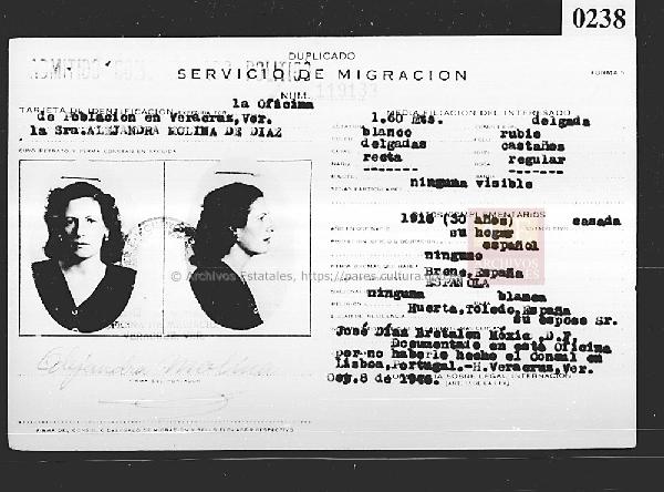 También se le facilitó una tarjeta de admisión a Alejandra Molina, en la misma oficina de migraciones de Veracruz, documento que se le expide, textualmente, “en esta oficina por no haberlo hecho el cónsul en Portugal”, concediéndose, también, la admisión en calidad de asilada política. Gracias a estas tarjetas, acompañadas por las fotografías de los cuatro asilados extremeños, podemos saber sus características físicas.