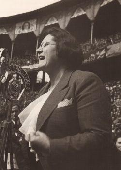 Mi primera noticia sobre ella era cuando niña, pues mi madre hablaba de ella y siempre decía que llenaba las plazas de toros, y claro, yo, niña andaluza, pensé que sería una torera de mucho éxito. Vi alguna foto, escondida, y me resultó extraño que la ropa no se correspondiera con la de un torero, y en esa instantánea se la veía gruesa, pero efectivamente estaba en una plaza de toros con mucha gente. Con el tiempo, me di cuenta que Federica Montseny no era una torera, sino una mujer muy buena, que quería que todo el mundo acudiera a la escuela y tuviera educación, que todo el mundo tuviera sanidad y que todo el mundo comiera. Más tarde la conocí en persona y escribí sobre ella. Me encargó el prólogo de uno de sus libros, Mis primeros cuarenta años. En ese prólogo relato un recuerdo: en el colegio, una niña me dijo que Federica era un demonio con cuernos y rabo, y que era verdad porque se lo había dicho su padre. Yo lo negué y quedó la cosa bloqueada, pero ahora con este prólogo podía decir lo que fue realmente Federica Montseny. A Federica le gustaba mucho que le contase la anécdota de ella como torera, se la conté mil veces pero le gustaba que se lo dijera yo, con mi forma de contarlo. También le gustaba que le cantara la canción de El Emigrante, una canción triste que habla de quienes se van del país.