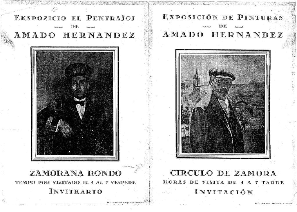 Asimismo, entre diciembre de 1928 y enero de 1929, realizó una exposición de pintura en el Círculo de Zamora donde publicitaba el idioma[30]. Los esperantistas editaron una invitación para el evento, impresa en castellano y en esperanto, que incluía también un catálogo bilingüe para la venta de los cuadros del autor.