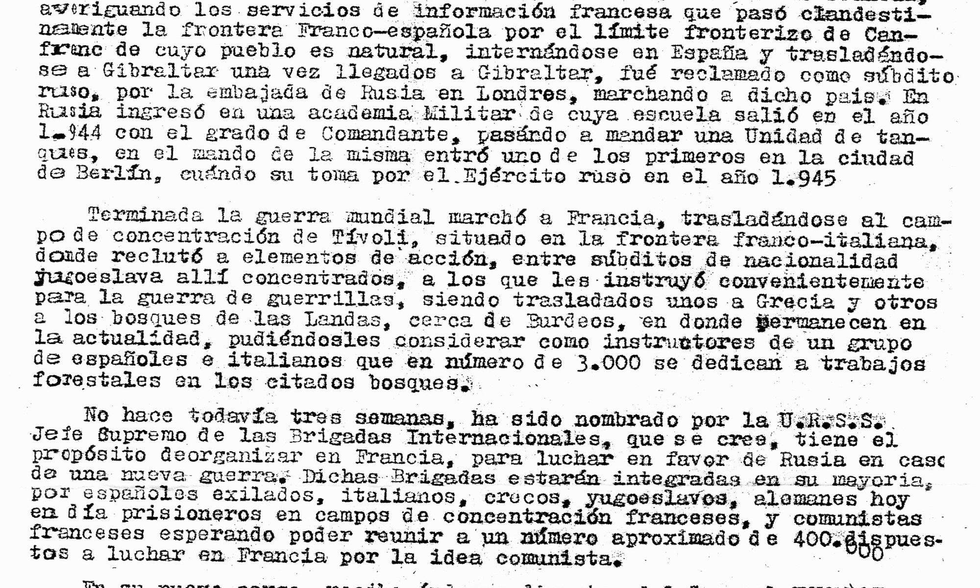 “ Asunto: Noticias recibidas aseguran que en los días pasados han desembarcado en el puerto de Sète (Francia), más de 700 españoles de los allí expatriados, los cuales fueron trasladados a Albania para formar parte de las Brigadas Internacionales que luchan contra Grecia. Asunto: Al mismo tiempo se dice que el Gobierno Republicano Español será trasladado a Yugoeslavia. Asunto: En los medios de los exiliados españoles en Francia, se asegura que la catástrofe de Cádiz fue un acto de sabotaje. Que será continuado por otros parecidos. 27/08/1947.