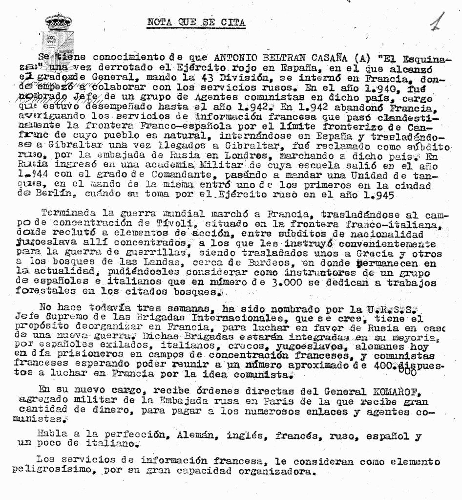 Y algo de ello habría, cuando en un informe reservado y redactado por militares españoles en una fecha aproximada al 1946, que apareció en el Archivo Militar de Avila, se dice que: “No hace tres semanas Beltrán ha sido nombrado por la URSS jefe Supremo de las Brigadas Internacionales, que se cree tienen el propósito de organizar en Francia, para luchar en favor de Rusia en caso de una guerra. Dichas brigadas estarán integradas en su mayoría, por españoles, exiliados, italianos, griegos, yugoeslavos y alemanes, hoy en día en campos de concentración franceses, y comunistas franceses esperando poder reunir a un número aproximado de 400.000 (hombres) dispuesto a luchar en Francia por la idea comunista.”