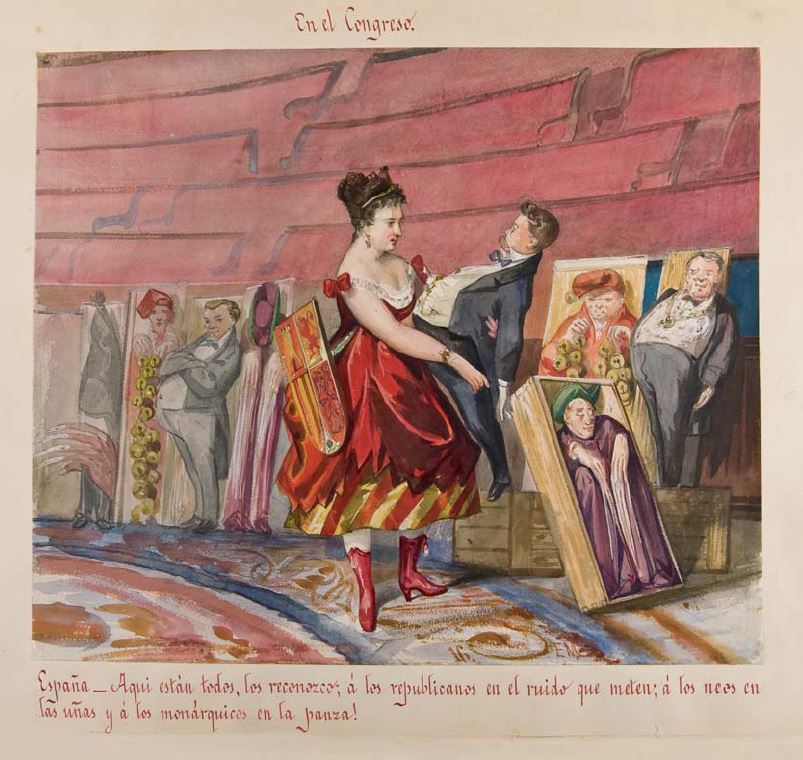 La nueva camarilla militar no había hecho la revolución para expulsar a la monarquía, sino a Isabel II. Las elecciones alentaron tanto a republicanos como a monárquicos a salir a la calle a hacer proselitismo de sus ideas. Las palabras dirigidas por el triunvirato -Serrano, Prim y Topete- a la gran manifestación monárquica celebrada en Madrid a mediados de noviembre, proclamando “la forma monárquica como la única posible para su magnánima y querida patria”, a la que acudieron, según Crónica de Badajoz, cerca de 30.000 personas[20], no deja duda sobre el carácter del nuevo gobierno provisional, que ya daba por hecho la restauración de un monarca en el trono.