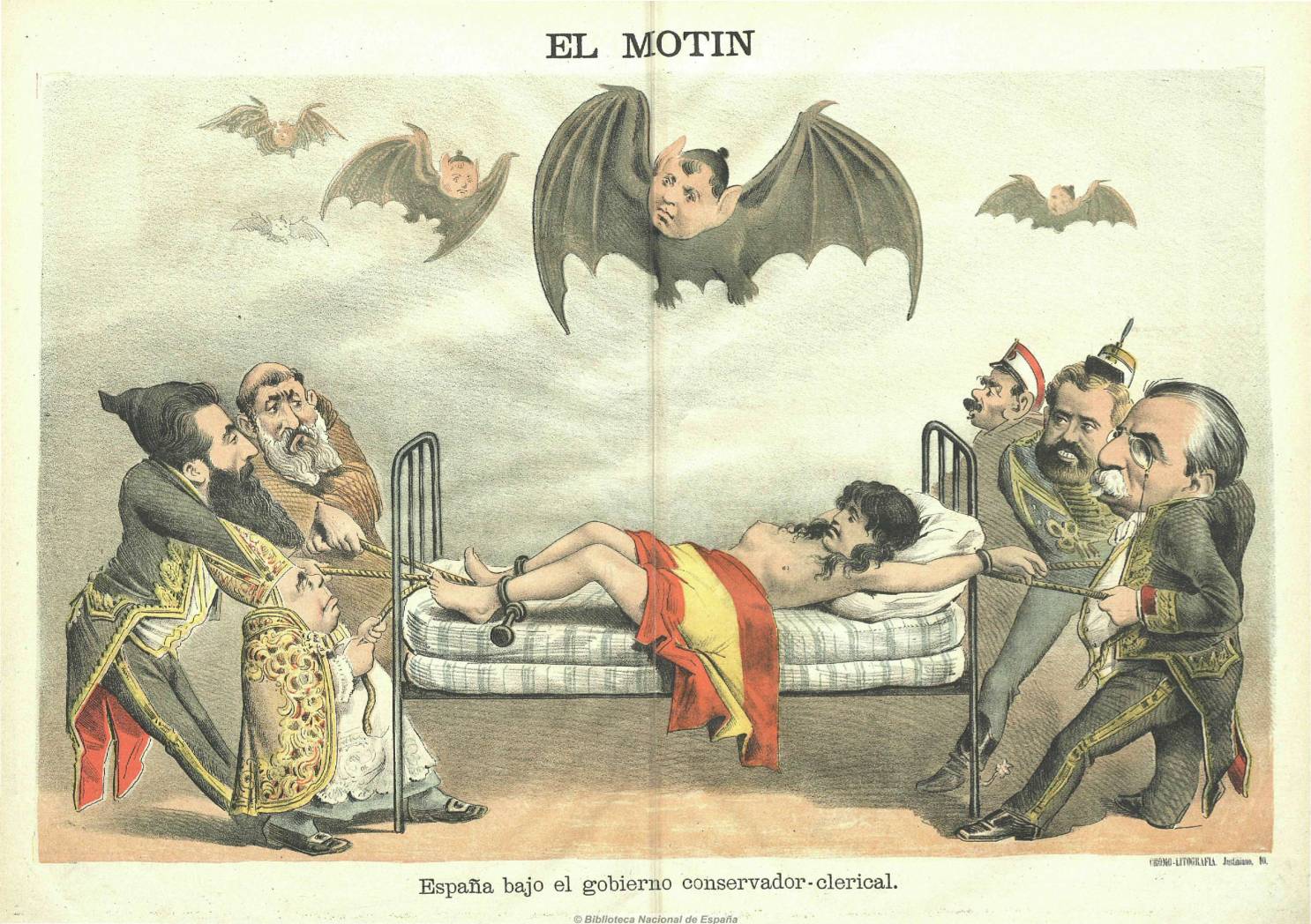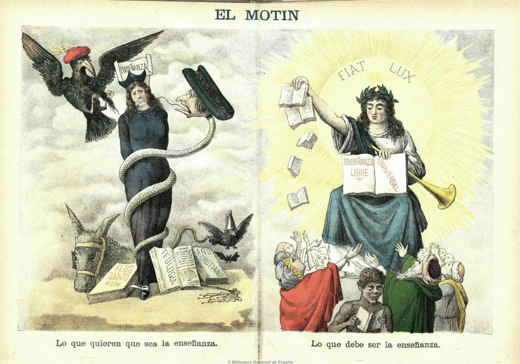 Por aquel entonces, como ahora, los mayores enemigos de la Iglesia católica eran el racionalismo y el librepensamiento. Sin ser cien por cien teorías o doctrinas que predicasen el ateísmo, proponían un modo de vida y de pensamiento que no estuviera determinado por las creencias religiosas, mientras se rechazaba de plano el fanatismo religioso y sus tradicionales rituales, que ocupaban todo el espacio y el tiempo público. Si algo unía a masones, anarquistas, socialistas y republicanos federales en este último tercio del siglo XIX era su condición como librepensadores, cuya actitud o doctrina no estaba sujeta a dogmas, particularmente religiosos, en el ejercicio de su razón. El anticlericalismo de la época, del que hacían gala en todo momento, iba más allá de la mera animadversión a los tragasantos, mojigatos y clerigalla en general. Con sus acciones anticlericales denunciaban la práctica de una Iglesia metomentodo que metía sus sayas en cualquier asunto, fuera o no de su competencia espiritual, abordando temas no religiosos, con especial interés en la educación y la política, sobre todo en la de Gobierno. A falta de una acepción asentada de la palabra laicismo, ajena aún al significado con el que hoy día la entendemos, el anticlericalismo actuaba como el motor que abogaba por la clara separación entre Iglesia y Estado. Periódicos profusamente ilustrados con imágenes anticlericales, como El Motín (1881-1926) -impulsado por José Nakens y Juan Vallejo-, La Broma (1881-1887) -dirigida por Eloy Perillán-, El Buñuelo (1880-1881), El Clarín (1881), La Mosca Roja (1882-1884), Don Quijote (1892-1903), El Diluvio Ilustrado (1904-1911) y otros posteriores, con una tirada de miles de ejemplares que les hacía llegar a cualquier confín de la península, las islas y las colonias, fueron sus mejores altavoces.