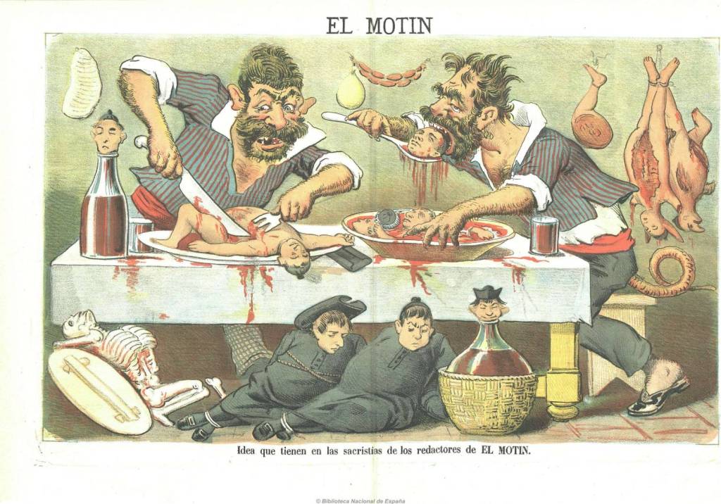 Para conocer mejor el anticlericalismo de la época a través de la prensa satírica, recomendamos el artículo de Sergio Sánchez Collantes “Las caricaturas anticlericales en la prensa política de la Restauración”, en Gonzalo Capellán (ed.), Tomo II. Miradas a la España de la Restauración desde la caricatura política, la iconografía y la prensa (1875-1923), Editorial de la Universidad de Cantabria, 2024, páginas 427-463. De Sergio Sánchez Collantes, Universidad de Burgos, se pueden consultar en línea diversos y muy interesantes artículos relacionados con los banquetes republicanos.